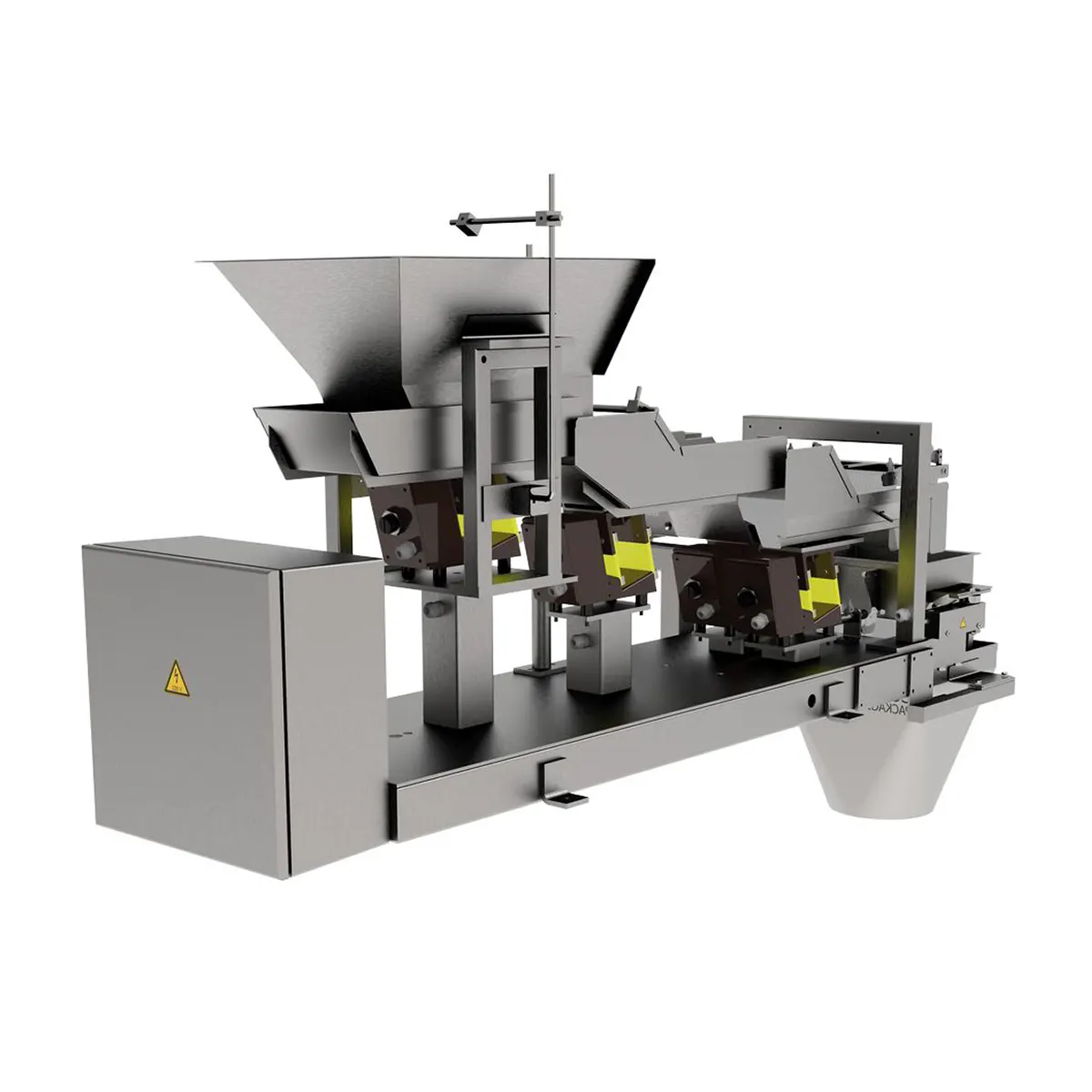La peseuse est munie d’une ligne de pesage, avec quatre plateaux vibrants pour transporter le produit à peser.